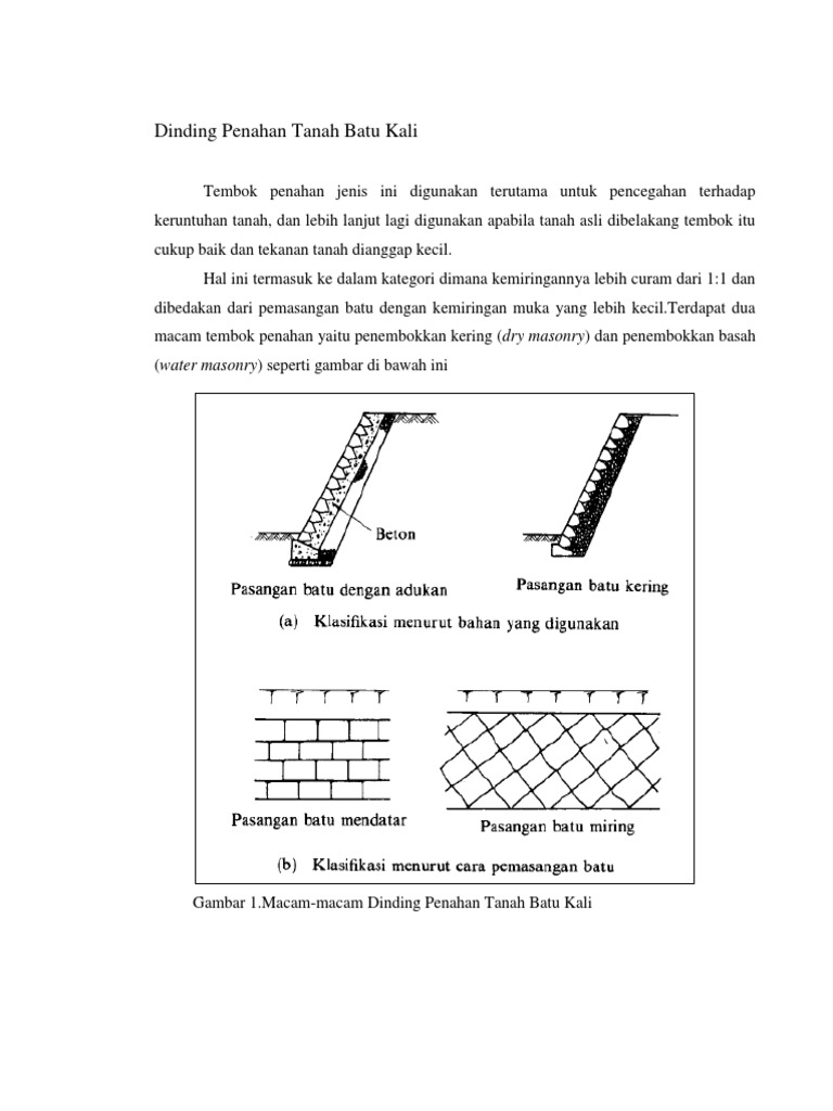 Retaining wall merupakan istilah di bidang teknik sipil yang artinya dinding penahan. Jenis konstruksi antara lain pasangan batu dengan mortar pasangan batu kosong beton. Bentuk Dan Ukuran Atau Dimensi Pasangan Batu Kumpul Engineer.